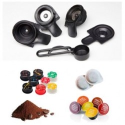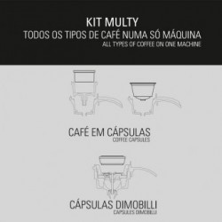 A máquina de café Dimobilli utiliza um manípulo com acessórios que se adaptam às várias medidas de cápsulas (Dolce Gusto ou Delta Q), pastilhas e pó que tem o nome de KIT-MULTY Dimobilli.